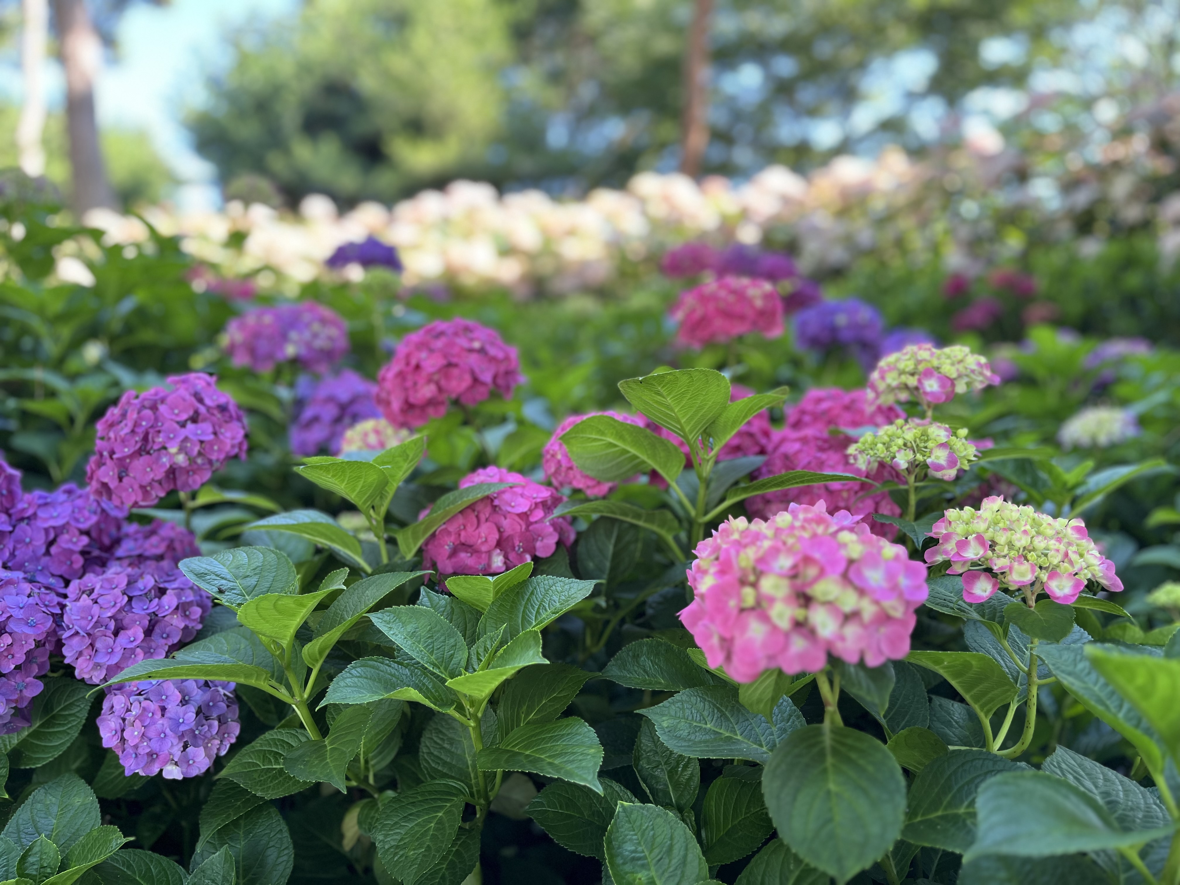 흰색, 분홍색, 보라색 수국들이 온 공원을 가득 메우고 있었습니다.
